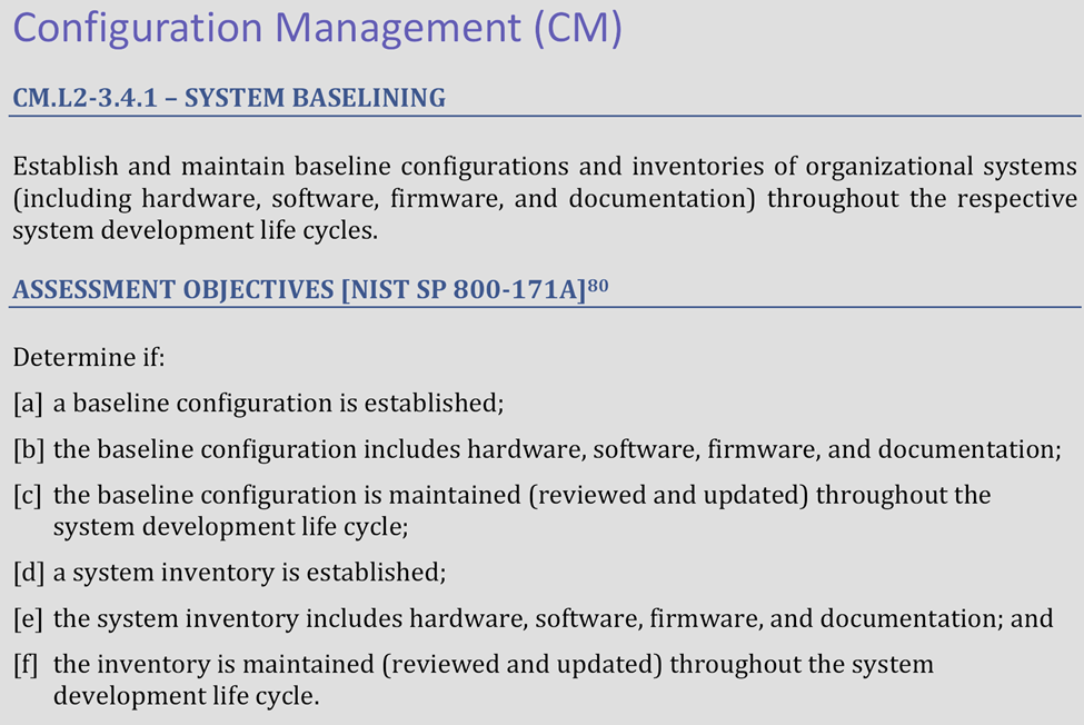 • NIST SP 800-171A, 3.4.1 (assessment objectives and methods).